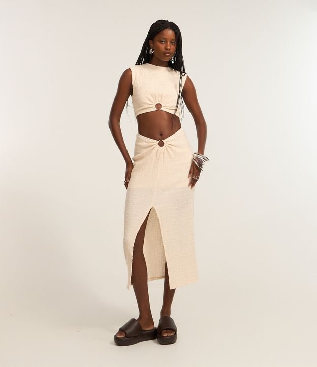 Saia midi confeccionada em algodão com textura e aviamento no cós.