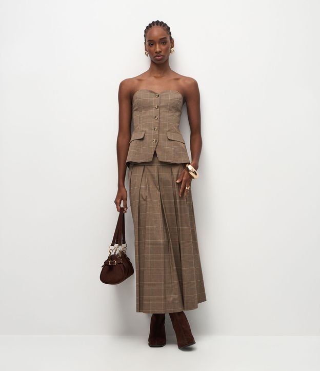 Saia Midi Xadrez Alfaiatada com Cinto e Pregas Marcadas Marrom