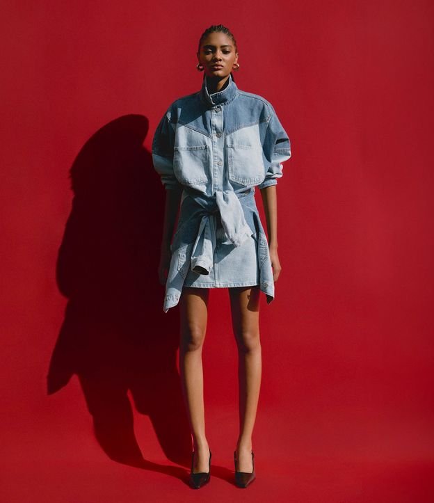 Saia confeccionada em algodão certificado BCI e boas práticas ambientais. Modelo mini com cintura média, cós com passantes e fechamento frontal por botão e zíper. Possui recortes contrastantes em dois tons de azul que valorizam a silhueta e entregam visual moderno e urbano para compor produções casuais.