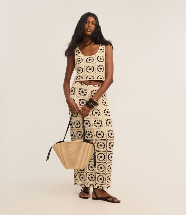 Saia New Midi com Efeito Crochetado com Flores Bege