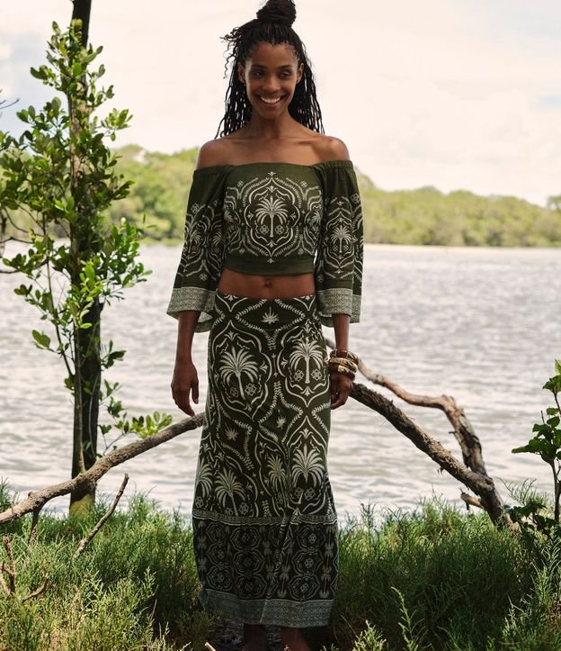 Saia New Midi em Piquet com Estampa Arabesco Tropical Verde