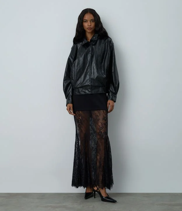Saia New Midi em Ponto Roma com Renda Floral Preto