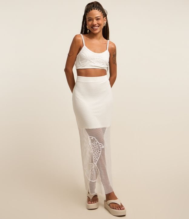 Saia New Midi em Tricô com Malha Telada e Bordado de Peixe