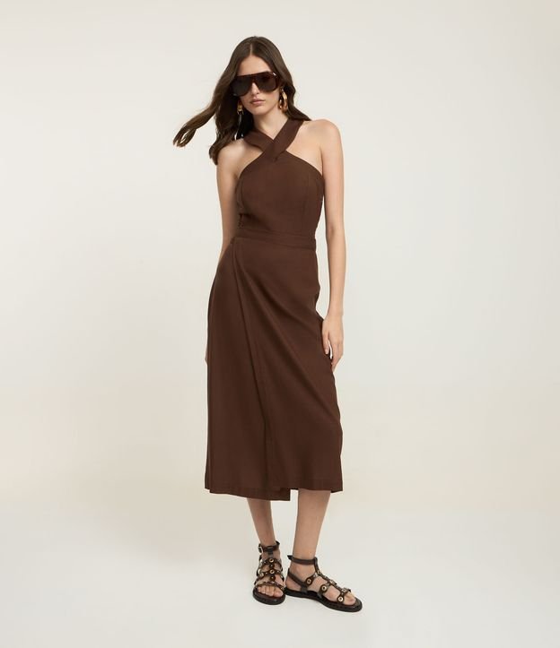 Saia New Midi em Viscolinho com Transpasse Frontal e Amarração Marrom