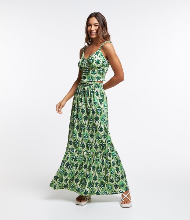 Saia New Midi Texturizada com Estampa Folhagens e Tiras Trançadas no Cós