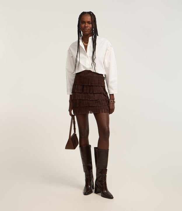 Saia Reta Estilo Folk em Suede com Camadas de Franjas Marrom