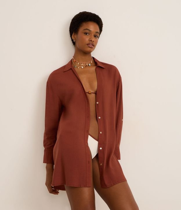Saída de praia camisa confeccionada em viscose e linho, com gola colarinho e mangas longas. Possui fechamento por botões e fendas laterais.