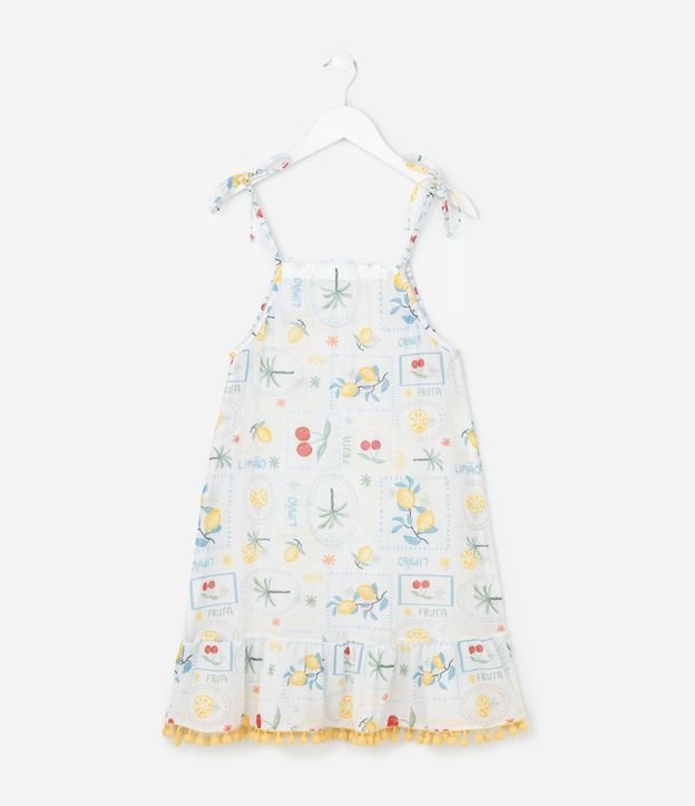 Saída de praia infantil, confeccionada em tule, com decote quadrado, alças finas, com lacinhos, estampa de frutinhas e babado na barra com mini pompons.