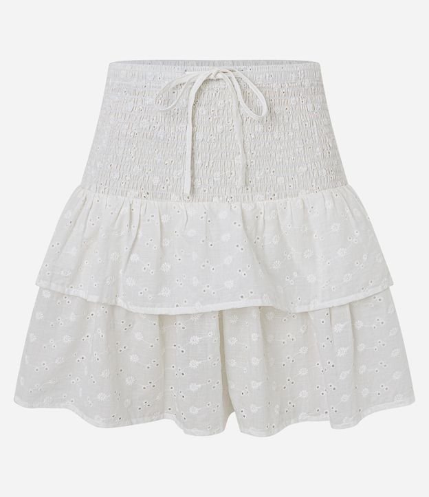 Saída de praia confeccionada em laise de algodão BCI. A saia curta tem cós largo em lastex e camadas de babados.