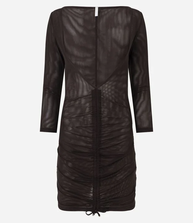 Saída de praia confeccionada em tule, no modelo vestido. Possui manga longa, franzidos e amarração frontal.