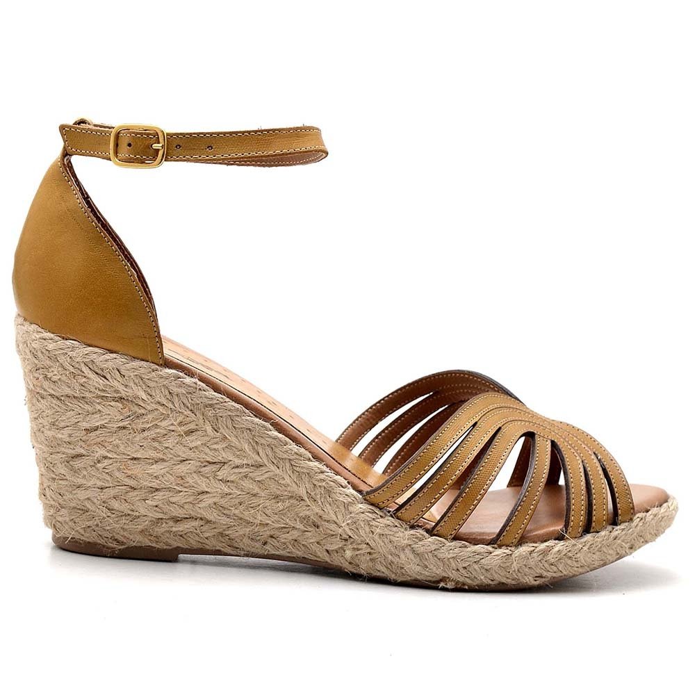 Sandália Anabela em Couro Feminino Tiras Fivela Sola Corda Confortável Amarelo