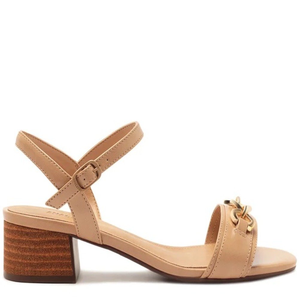Sandália de salto bloco, com detalhe em elos metálicos, na cor bege. O modelo apresenta cabedal em material similar ao couro, com uma tira mais larga sobre os dedos, com detalhe imponente em aplicação de tira sobreposta, com maxi elos metálicos - estilo corrente. De biqueira quadrada, possui salto em bloco médio e palmilha comfy, com assinatura Anacapri. Com tira traseira que contorna o calcanhar, conectada na tira que abraça o tornozelo, apresenta fecho lateral afivelado.