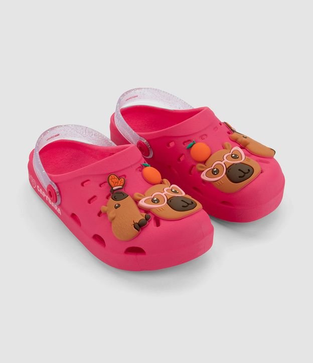 Sandália infantil de modelo babuche, com bico redondo, furinhos e tira de sustentação. Possui patchs de Capivara.