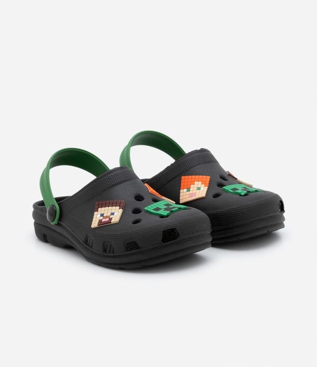 Sandália infantil de modelo babuche, confeccionada em pvc, com bico redondo e textura de furinhos. Possui patch no Minecraft e tira traseira contrastante.