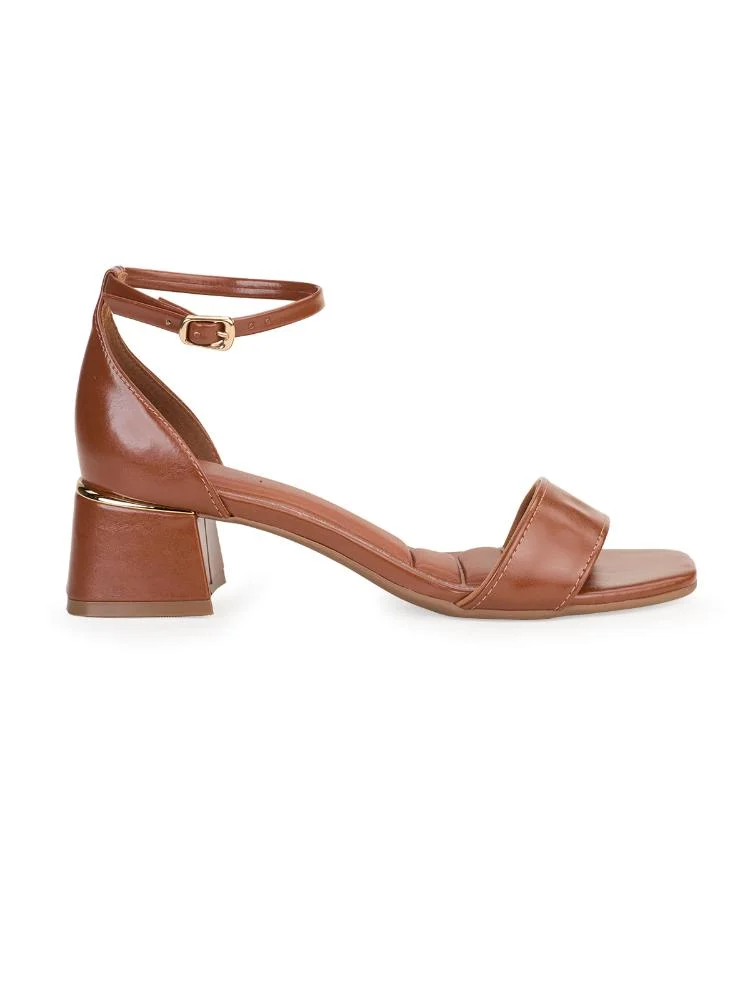 Sandália Bebecê Salto Bloco Com Detalhe Dourado Bico Quadrado Marrom