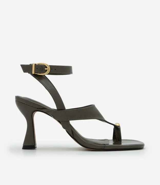 Sandália feminina em PU com dedeira. Possui pala larga estruturada, detalhe metálico aplicado sobre a dedeira, tira envolvendo o tornozelo com fivela ajustável e salto médio com formato quadrado.