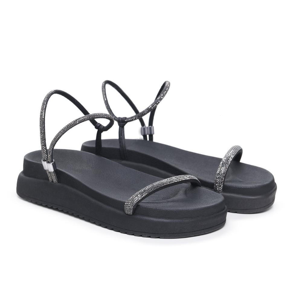 Sandália Feminina Papete Flatform Tiras Strass Elegante Preto