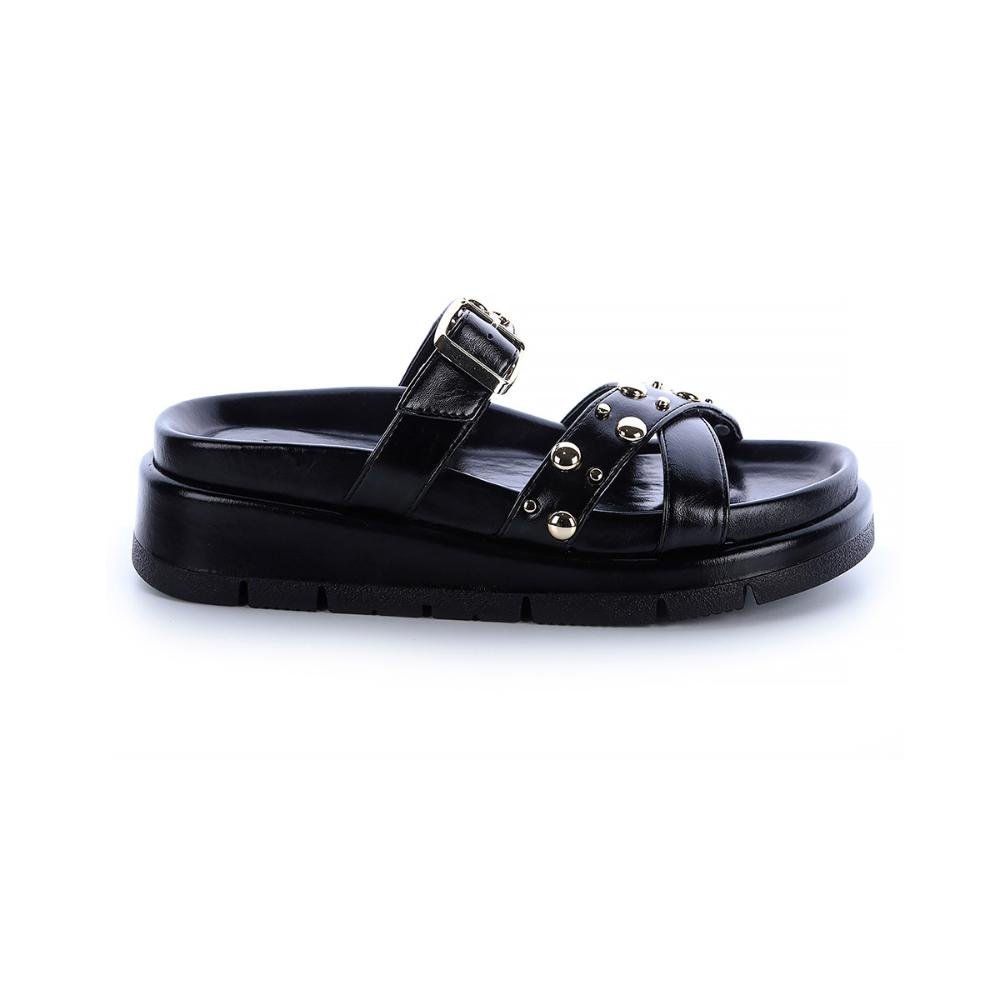 Sandália Flat Stefani Preto Metais Dourado