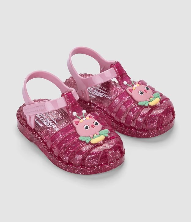 Sandália infantil em PVC, com bico redondo, com tiras, ajuste por velcro, glitter e patch A Casa Mágica de Gabby.