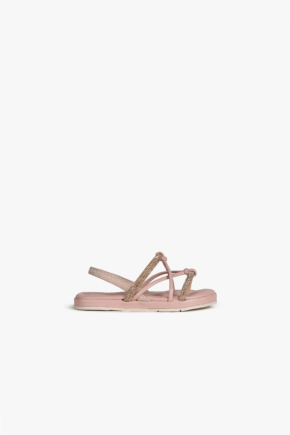 Seu design encantador apresenta um cabedal composto por tiras finas entrelaçadas e adornadas com delicados strass, que adicionam um toque de brilho e sofisticação ao modelo. O calce fácil garante praticidade, tornando esta sandália perfeita para o dia a dia ou ocasiões especiais.