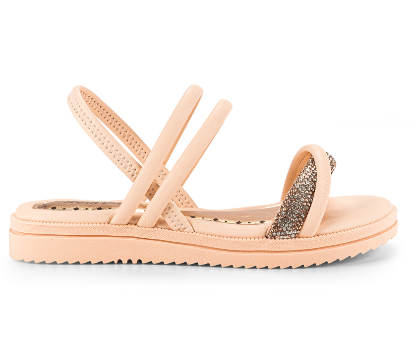 O modelo possui tiras finas e macias que envolvem os pés, proporcionando um ajuste perfeito e confortável. Já o calce fácil, graças à tira maleável e sem fechamentos que envolve o calcanhar, torna a sandália ainda mais prática. Ainda conta com sola flatform, com 2 cm de altura, que adiciona um toque de estilo e garante um caminhar mais seguro. O destaque fica por conta da tira frontal repleta de brilhos, que traze um toque de sofisticação e elegância para os looks.