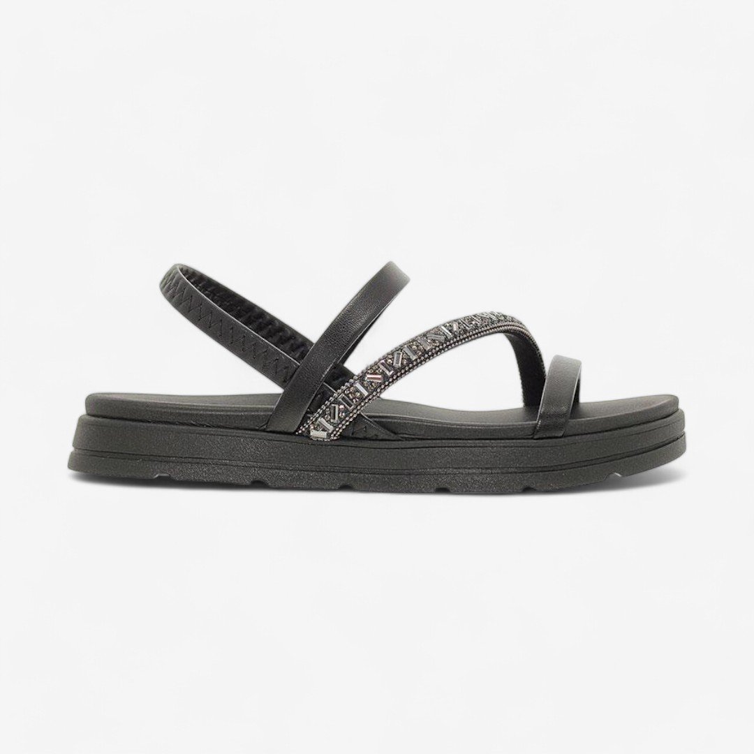 O elástico na parte de trás garante um calce fácil e ajustável, proporcionando segurança e comodidade ao caminhar. A tira de strass transpassando diagonalmente no peito do pé adiciona um toque de brilho e sofisticação, tornando esta sandália uma escolha ideal para diversas ocasiões.