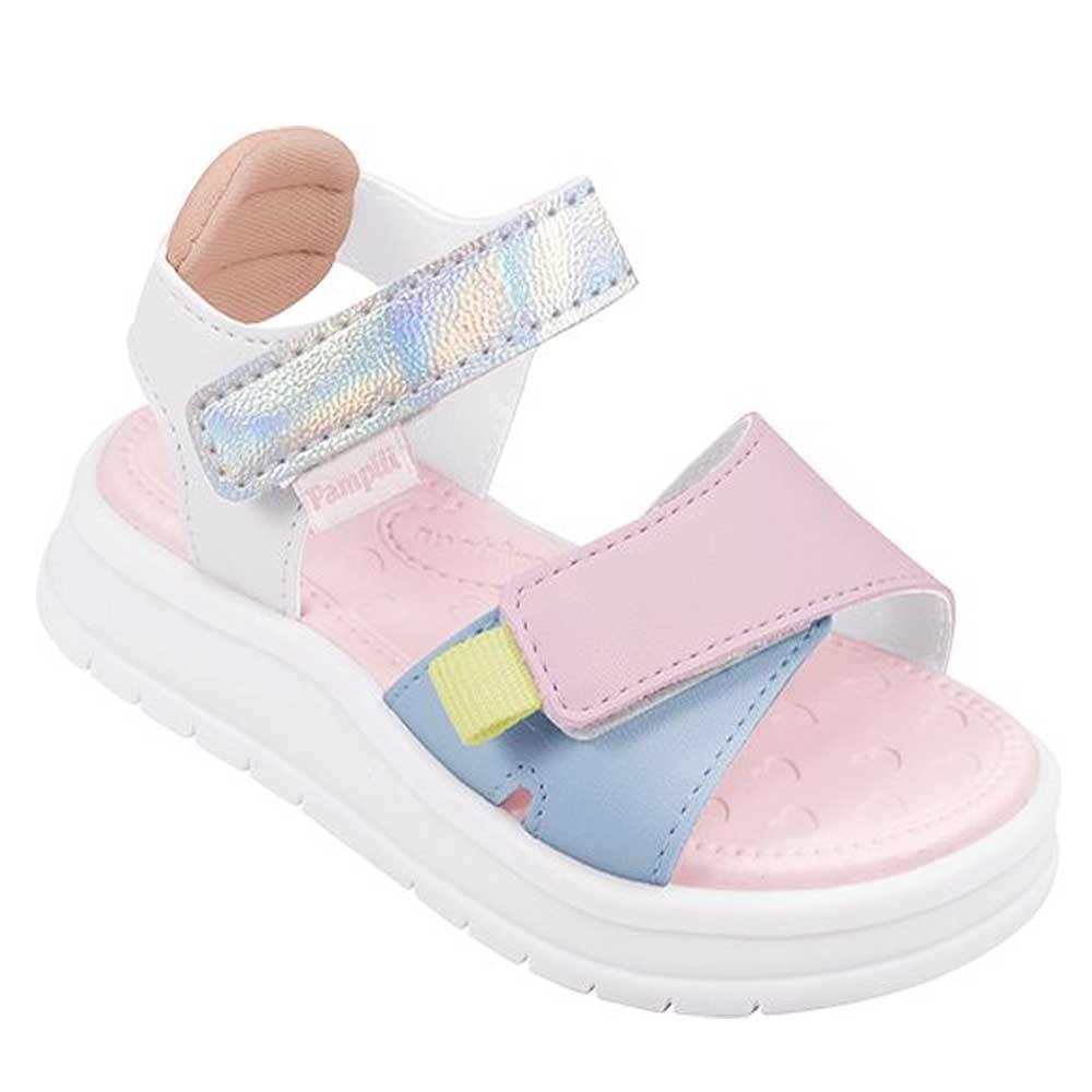 SANDÁLIA PAPETE INFANTIL PAMPILI PETIT BRANCA E COLORIDA. Sandália infantil feminina em sintético branco e colorido, um modelo moderno e atual para as bebês passearem com muito estilo e conforto! Palmilha anatômica de EVA com espuma para mais conforto ao caminhar. A sandália de bebê tem solado emborrachado com tecnologia do TR Eco que leva em sua composição 20% de matérias primas vindas de fontes renováveis, entregando uma performance flexível e antiderrapante, dando segurança aos primeiros passinhos. Sandália calce fácil com tiras aderentes, trazendo praticidade para a mamãe, trabalhando a autonomia da menina e podendo regular em cada pezinho. Ainda pensando nisso, a sandália possuí escrita em braile no solado, indicando o lado direito e esquerdo para as meninas cegas ou com baixa visão!