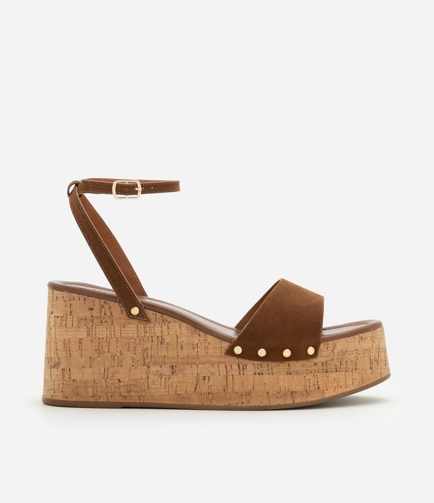 Sandália Plataforma de Tiras com Efeito Camurça e Salto com Textura Marrom