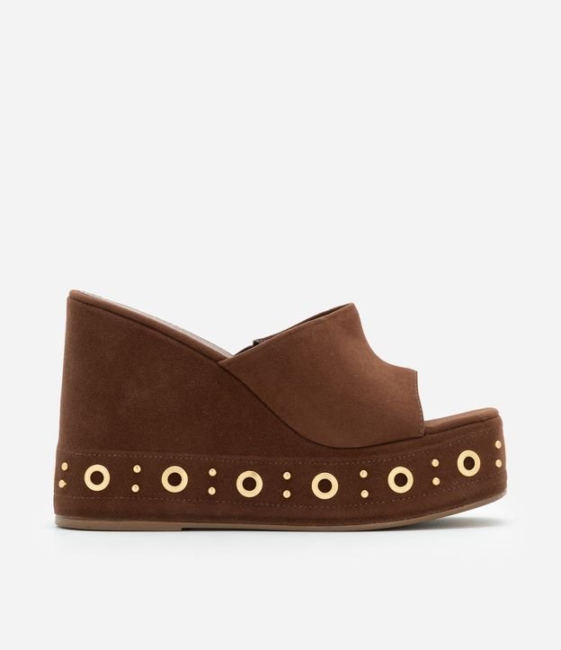 Sandália plataforma com cabedal em peça única ampla, abertura frontal arredondada e material de superfície aveludada. Palmilha lisa com leve acolchoamento. Plataforma contínua com inclinação traseira e base reta. Laterais decoradas com apliques metálicos circulares em tamanhos variados.