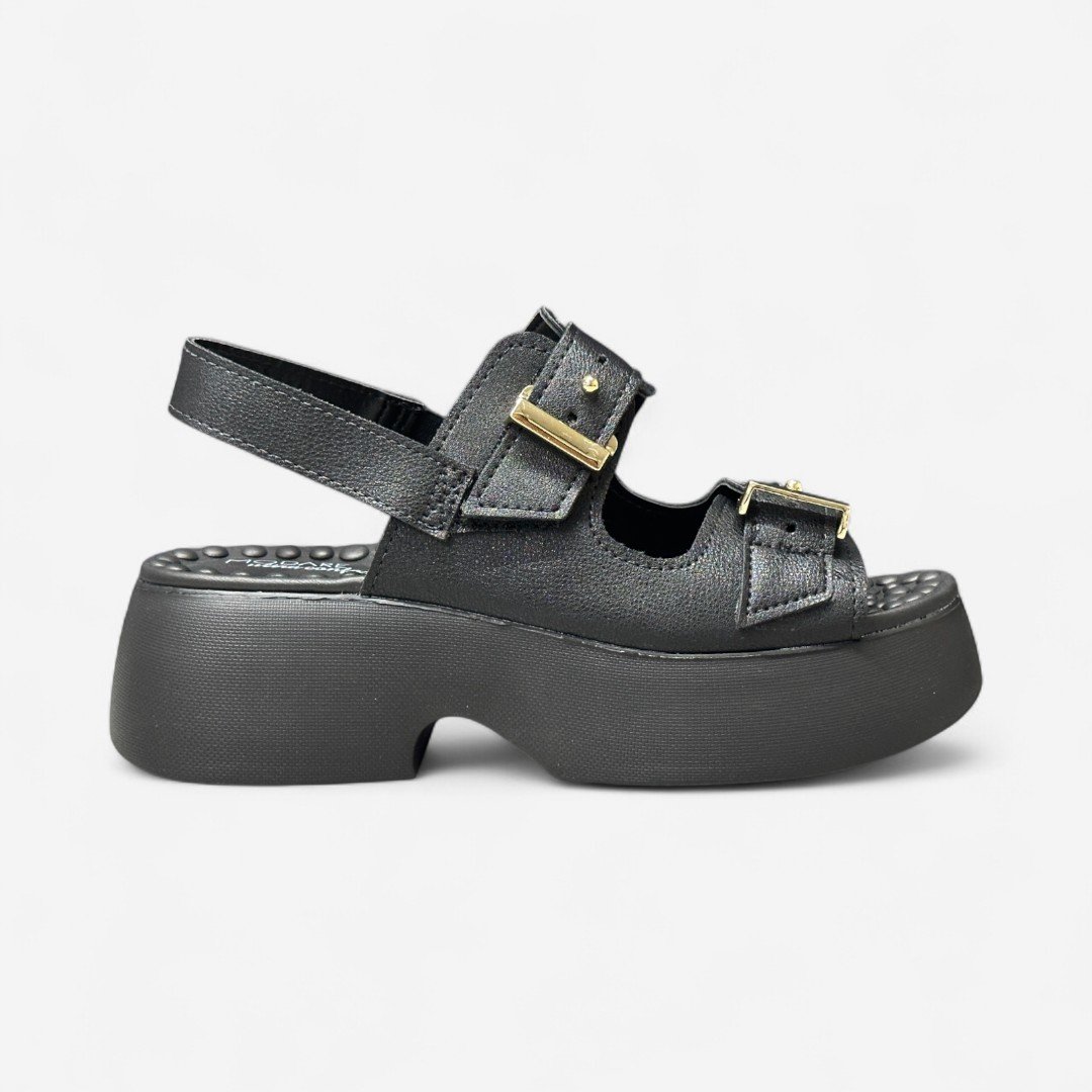 Estilo do produto: sandália plataforma papete feminina com detalhe em fivela
