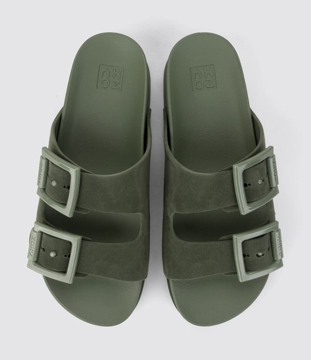 Sandália rasteira com tiras com fivela, bico redondo e solado diferenciado.