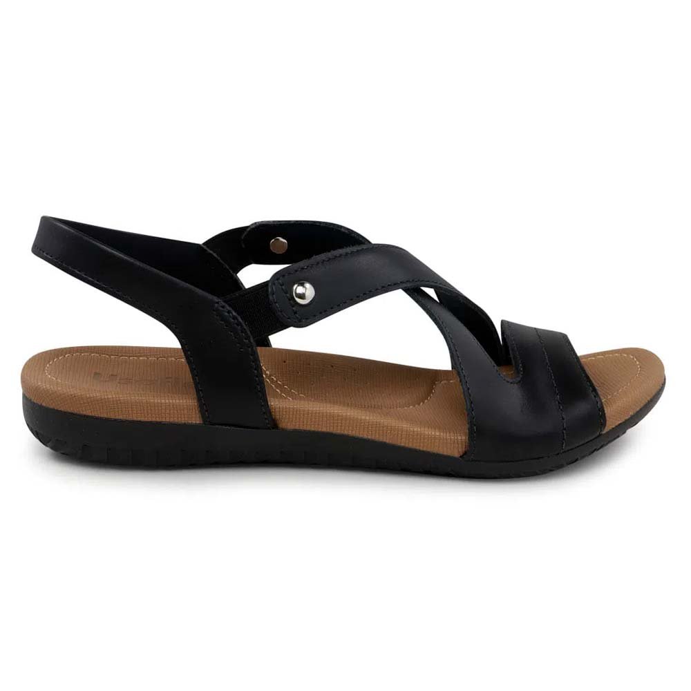 Sandália em couro preto com elástico e modelagem ergonômica, proporcionando um ajuste diferenciado aos pés e calce facilitado.