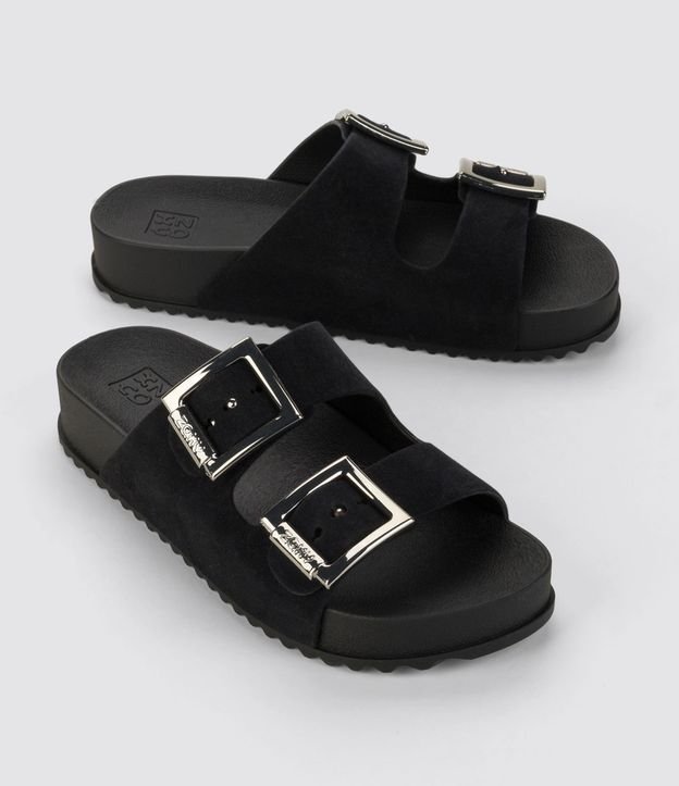 Sandália rasteira com tiras com fivela, bico redondo e solado diferenciado.