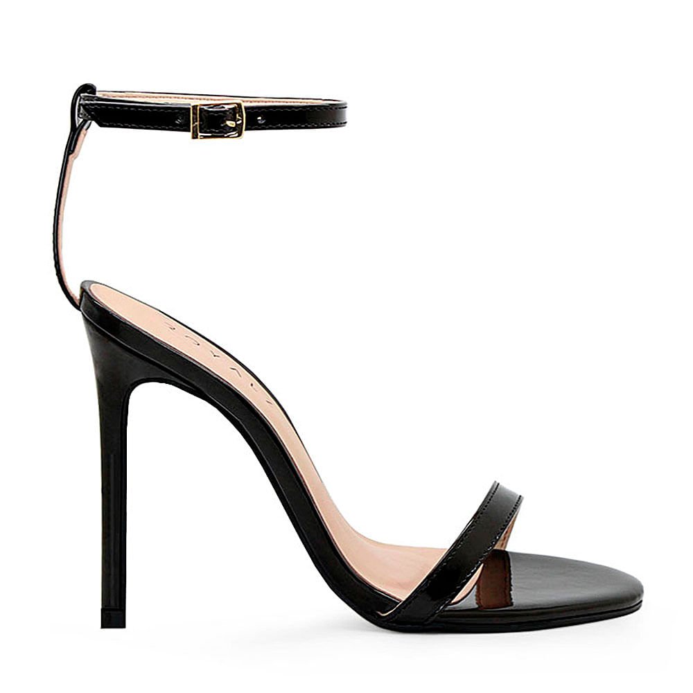 Sandália verniz, salto fino de 11,5cm e solado vermelho laqueado.