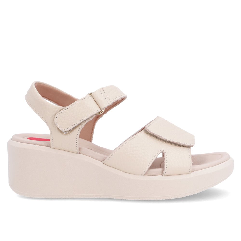 Sandália plataforma cabedal em couro relax catalano na cor vanilla. O modelo possui tecnologia Menor Impacto, proporcionando amortecimento no calcanhar e na planta do pé, oferecendo conforto principalmente para pessoas com esporão de calcâneo e metatarsalgia.