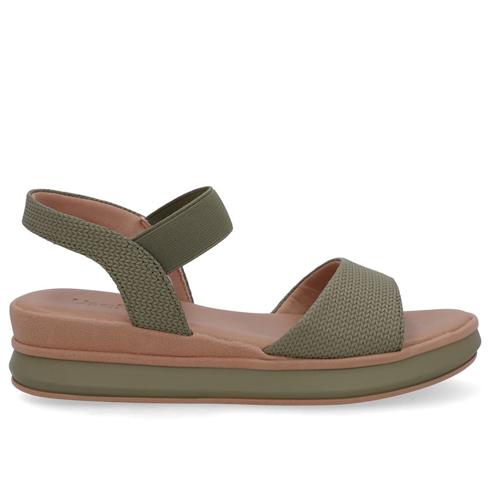 Sandália cabedal em couro tricô na cor militar. O modelo possui tecnologia Calce Fácil, com modelagem inteligente em adaptar o calçado a ergonomia dos pés.