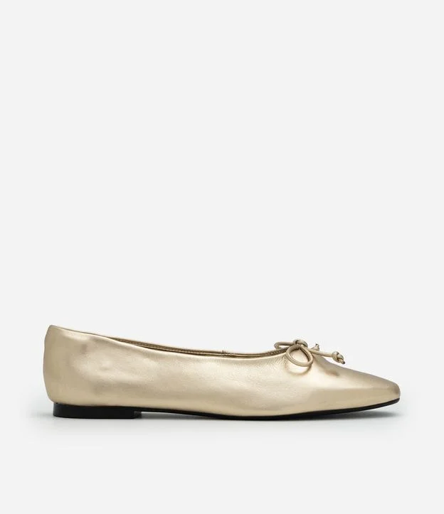 Sapatilha em Couro com Mini Laço no Cabedal Dourado