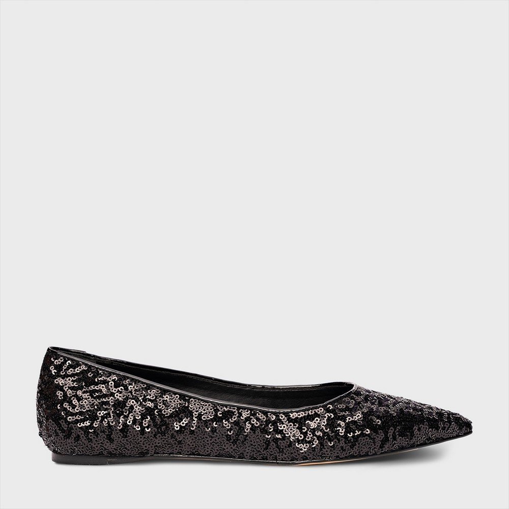 Shine bright! Saia do básico com essa sapatilha de couro suede com acabamento em lantejoulas, salto flat rasteiro e bico fino.