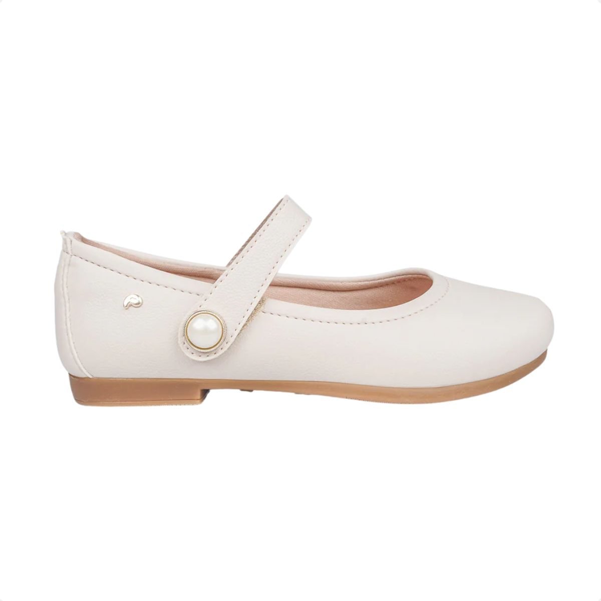 Sapato infantil feminino em sintético nude com tira superior com fecho em velcro e detalhe de pérolas na lateral, clássico e prático para acompanhar a menina em seu dia a dia e festas!