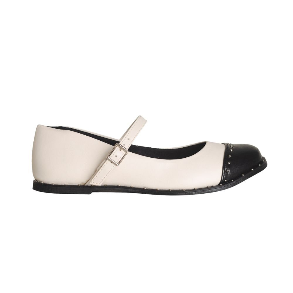 Sapatilha Feminina Dayane Magalhães da coleção Intense, modelo boneca com bico redondo, fivela, apliques de taxas no cabedal e laterais, confeccionada em material sintético.