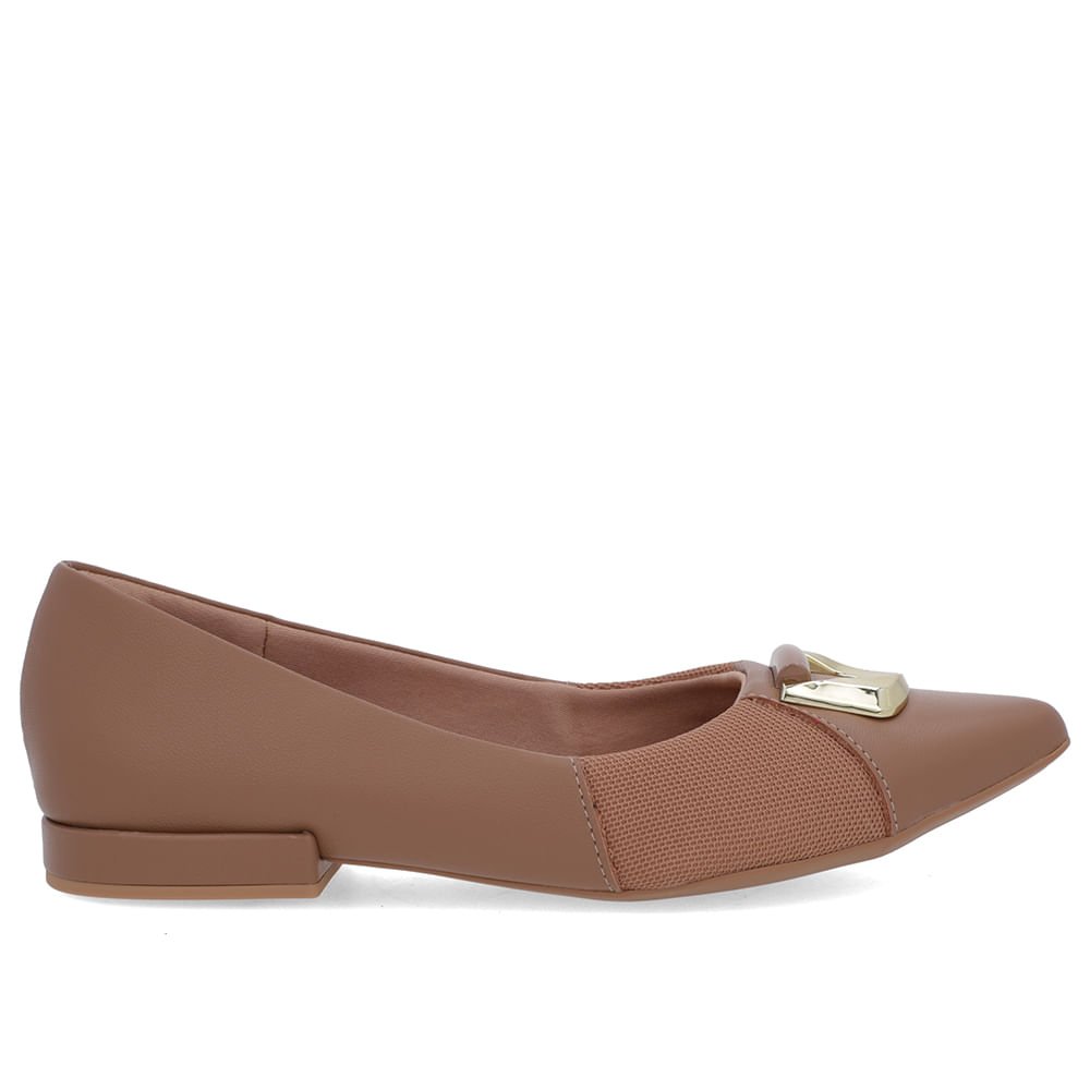 Sapatilha cabedal em couro napa valise e tecido na cor camel. O modelo possui tecnologia Joanetes, que alivia o desconforto da região, garantindo suavidade na pisada por usufruir de materiais moldáveis nos pés.