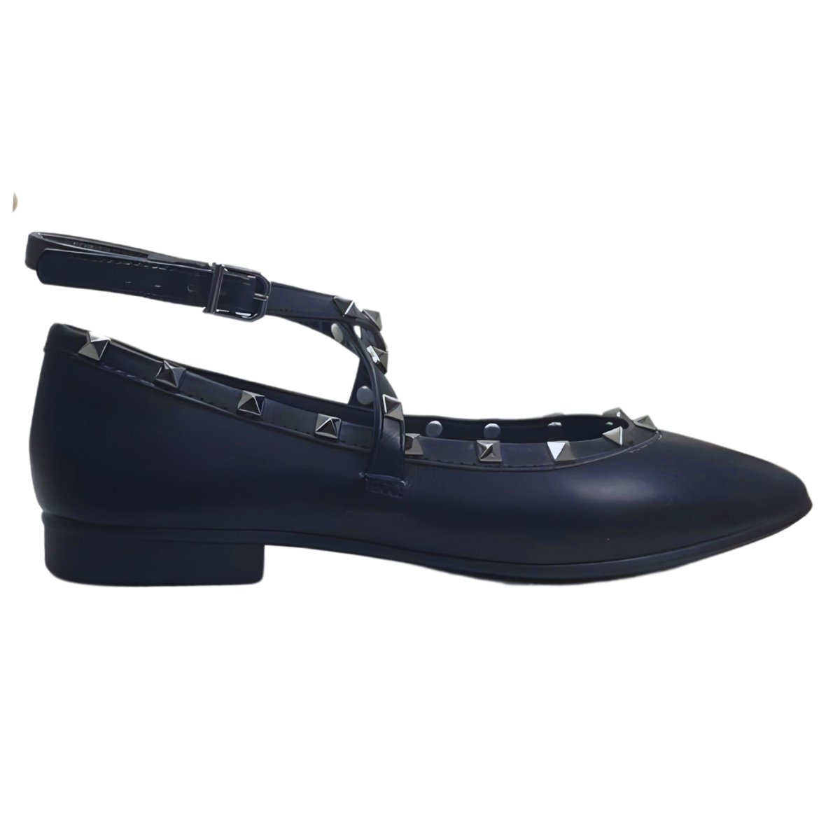 Esta sapatilha feminina é elegante e moderna, com um toque ousado devido aos spikes decorativos. Feita de couro sintético preto de alta qualidade, ela apresenta uma silhueta clássica de sapatilha com bico levemente quadrado e sola plana para conforto durante todo o dia.