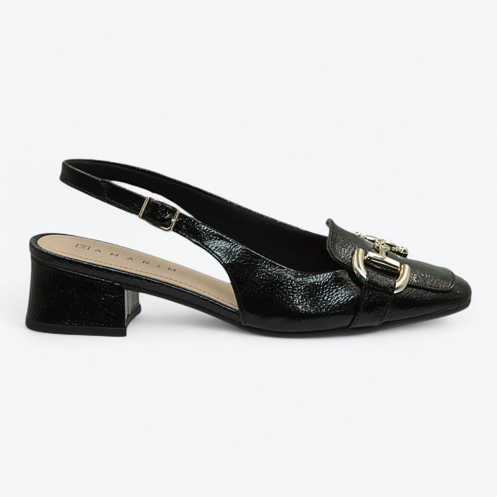 A fivela metálica dourada no cabedal adiciona charme e requinte, enquanto o salto bloco baixo oferece estabilidade e conforto para o uso diário. A tira ajustável no calcanhar garante um ajuste seguro e personalizado, ideal para acompanhar você do trabalho aos momentos de lazer com elegância.