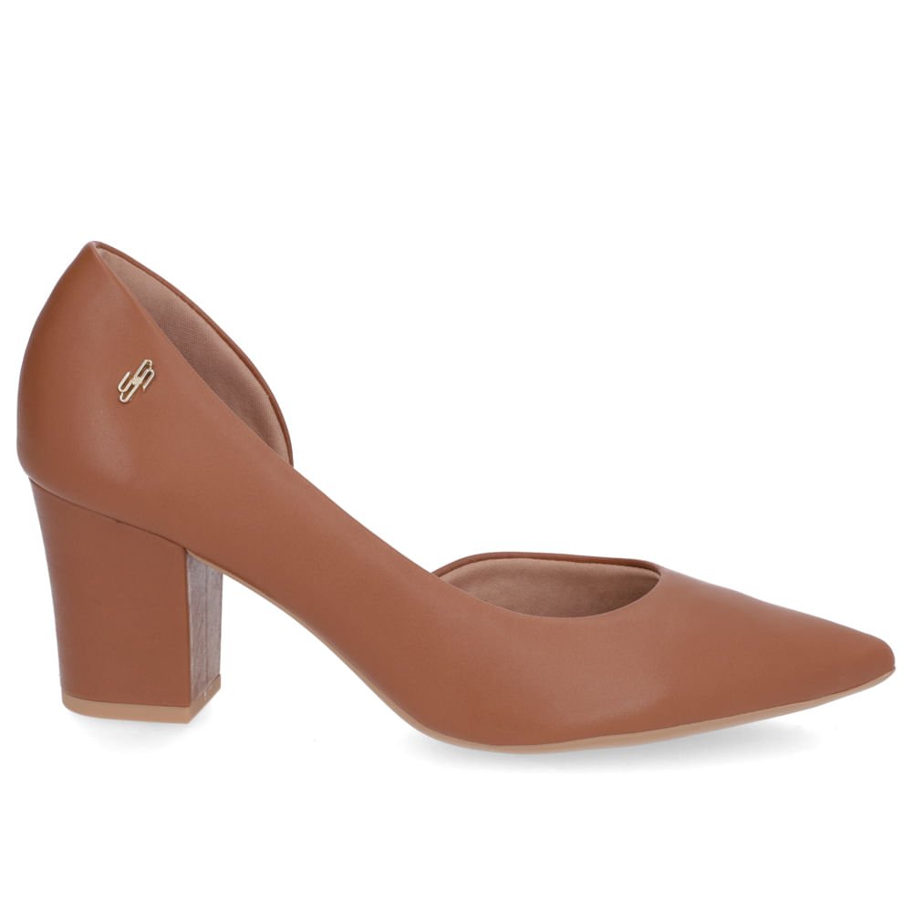 Scarpin salto bloco cabedal em couro vegetal canela. O modelo possui tecnologia Memória Permanente, com material de capacidade de retorno e mantêm o formato dos seus pés na palmilha.