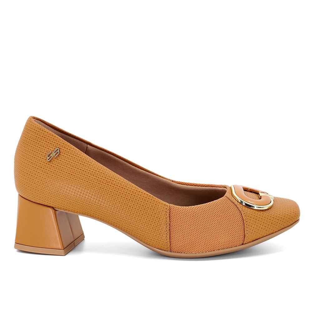 Scarpin salto bloco em couro tresse tan com enfeite monograma. O modelo possui tecnologia Cuidado Intensivo, contendo palmilha com anatomia especial que alivia dores e desconfortos na sola do pé, indicado para quem sofre com fascite plantar.