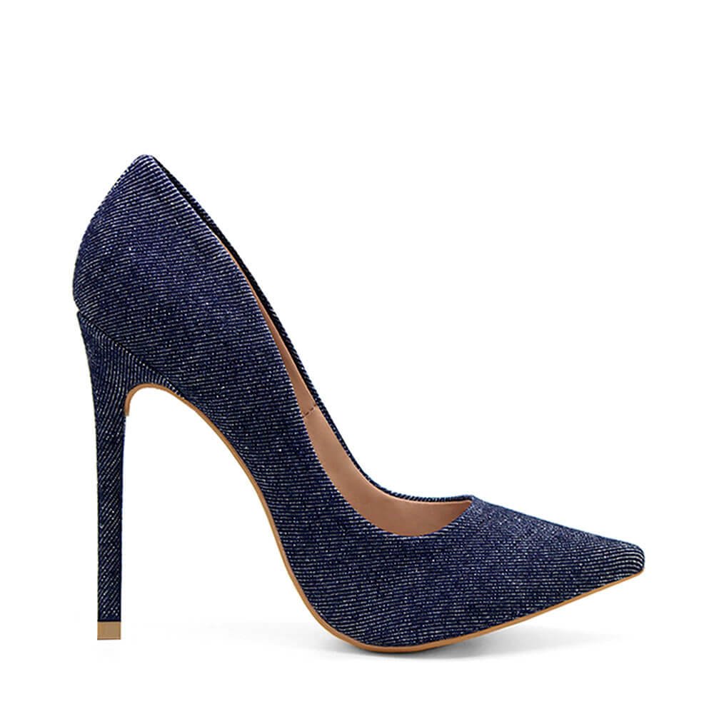 Scarpin tecido jeans, salto alto fino de 11,5cm, lateral rasa, palmilha acolchoada e solado laqueado.