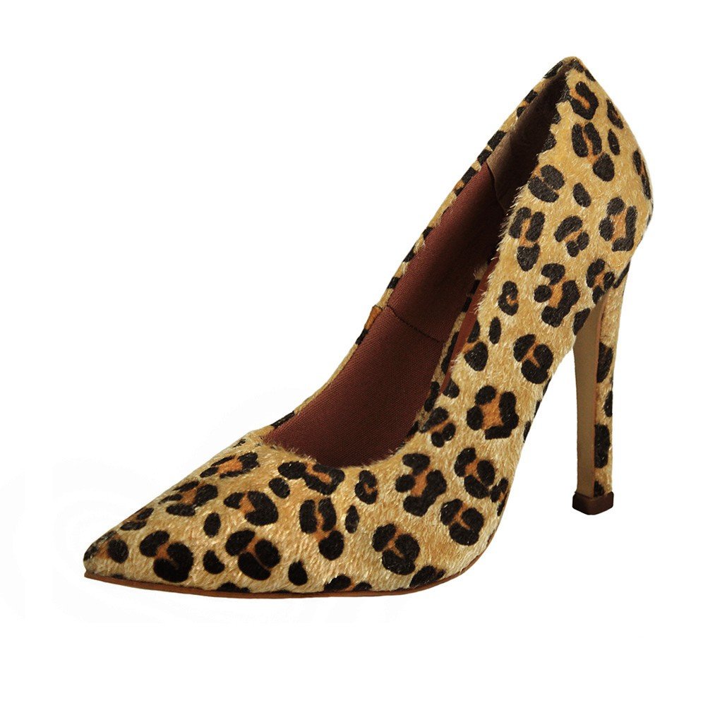 Linha de Scarpin Salto Alto Fino Luiza Sobreira, bico fino, produzido em material de pelo sintético com estampa de Onça. Possui palmilha com espuma PU., solado em TR.