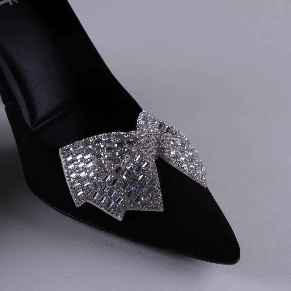 Laço decorativo com pedrinhas de brilho no cabedal, oferecendo um brilho adicional e um visual luxuoso.