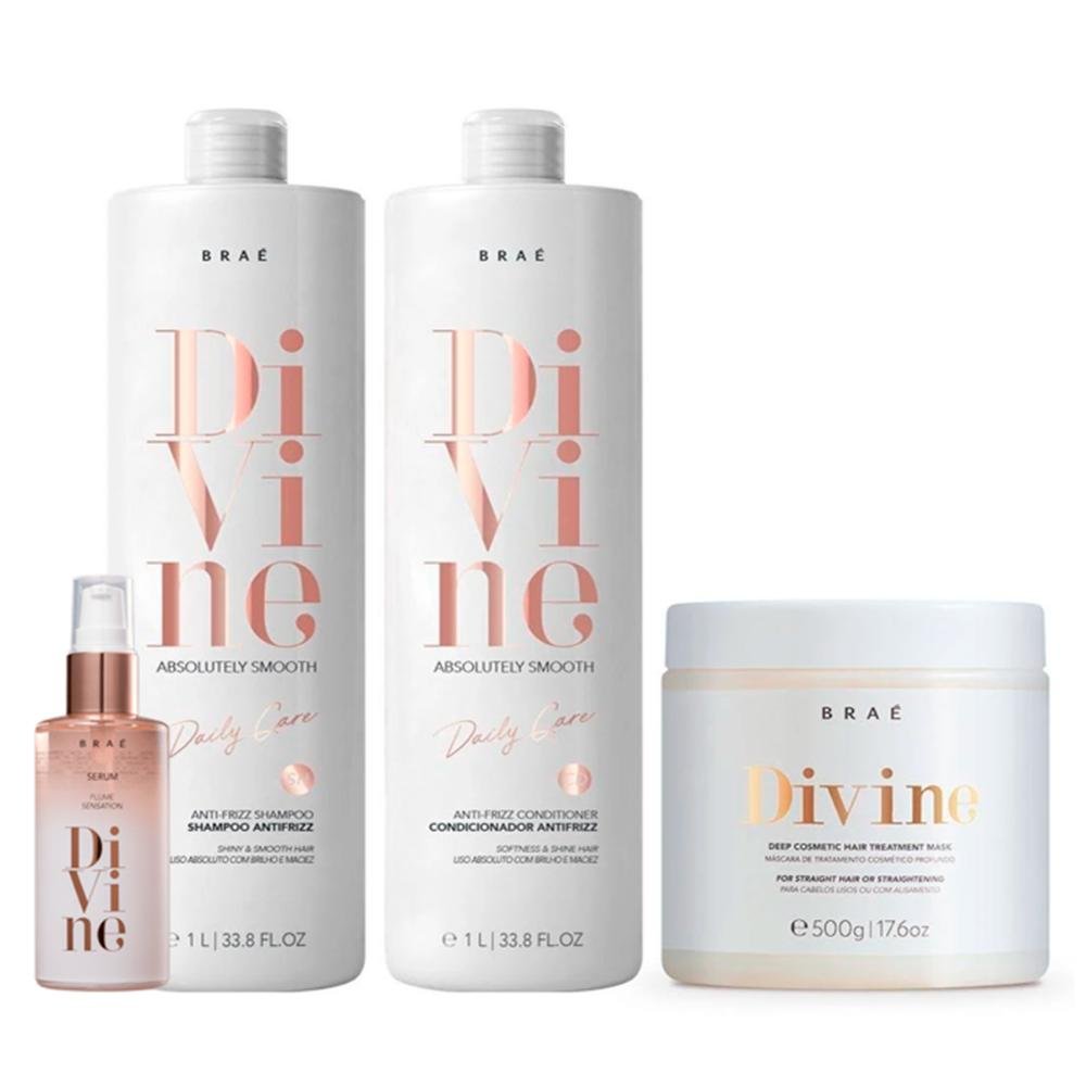 Kit BRAÉ Divine Shampoo, Condicionador, Mascara Capilar e Sérum Plume Sensation<br> <br>O Kit Contém:<br>01- Shampoo BRAÉ Divine - 1L;<br>01- Condicionador BRAÉ Divine - 1L;<br>01- Mascara Capilar BRAÉ Divine – 500ml<br>01- Serum Plume Sensation BRAÉ Divine – 60ml<br> <br>Sobre o produto:<br>Shampoo Divine: deixa os fios mais alinhados e disciplinados durante a limpeza.<br> <br>Condicionador Divine: traz um cuidado hidratante que desembaraça e disciplina os fios rebeldes.<br> <br>Máscara Divine: restaura profundamente a fibra capilar e recupera a força e a maleabilidade dos fios sem pesar.<br> <br>Serum Plume Sensation Divine: Sérum reparador para todos os tipos de cabelo. Nutre e combate danos como o frizz e as pontas duplas. <br> <br>Modo de usar:<br>Aplique o Shampoo BRAÉ Divine nos cabelos molhados e massageie o couro cabeludo até formar espuma. Enxágue. Repita o procedimento se necessário.<br> <br>Após lavagem com Shampoo BRAÉ Divine, aplique a Máscara de Hidratação Braé Divine mecha a mecha, começando pelas pontas, massageando suavemente até chegar à raiz. Deixe agir de 10 a 15 minutos e enxágue.<br> <br>Espalhe o condicionador sobre os fios úmidos depois de usar o shampoo. Comece pelas pontas, massageie suavemente e deslize os fios entre os dedos até que estejam desembaraçados. Deixe agir por alguns minutos e enxágue.<br>Aplique algumas gotas do sérum na palma das mãos e espalhe no comprimento dos cabelos até completa absorção. Finalize como desejar.<br> <br>Resultado<br>Cabelo, desembaraçado e disciplinado, livre do frizz e saudável.<br> <br>Cuidados/Restrições<br>Sempre prefira utilizar uma espátula para retirar o produto de dentro do pote, para garantir a proteção e eficiência do produto.<br> <br>Evite o contato com os olhos. Caso isso aconteça, enxágue com água em abundância. Havendo irritação, suspender o uso e procurar orientação médica. Não ingerir. Manter fora do alcance de crianças. Uso externo.