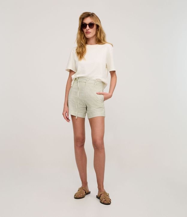 Short Alfaiatado Cintura Alta com Listras e Amarração Verde/Bege